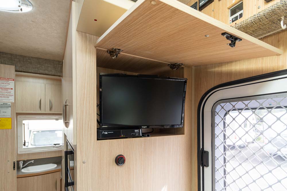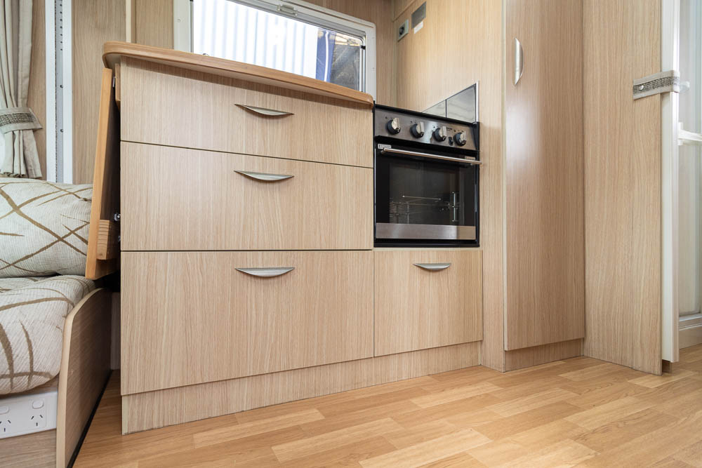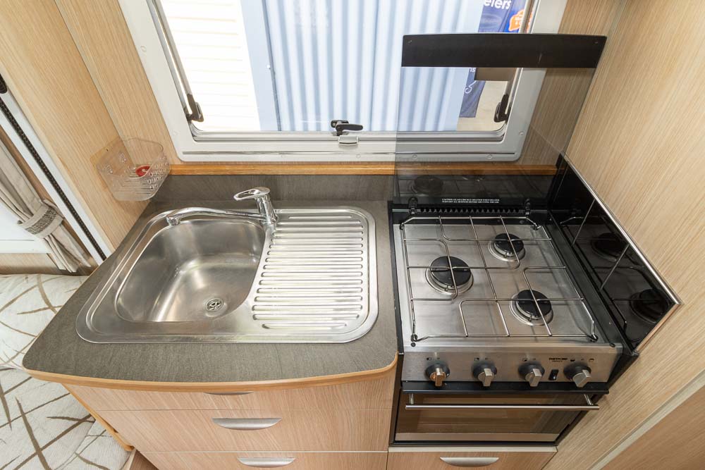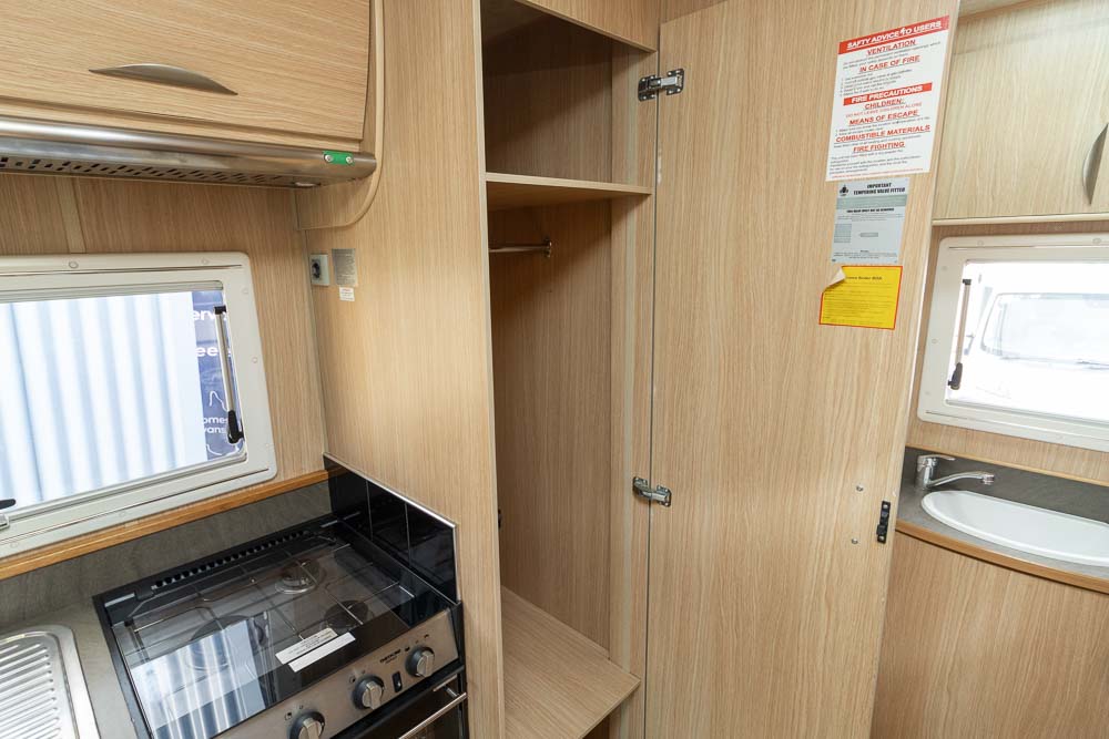 The kitchen is well-appointed with all essential appliances. On the driver’s side, you’ll find a sink and stove, each with a lid for extra bench space, plus a range hood and abundant storage. Opposite, near the entry door, is a three-way fridge and microwave, ensuring meal preparation is easy and convenient on the road.