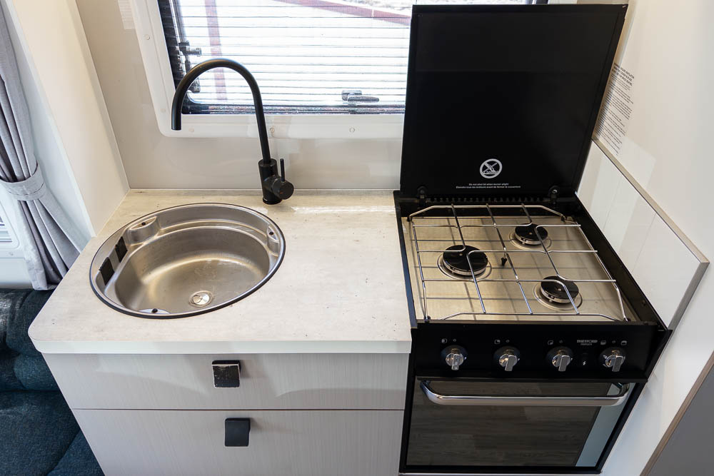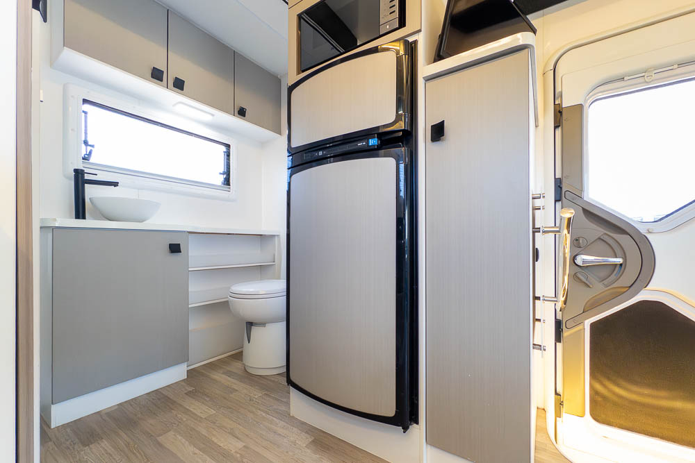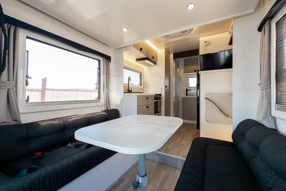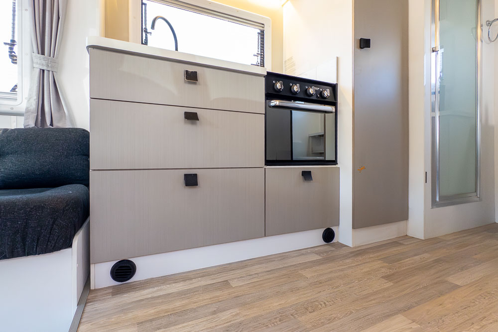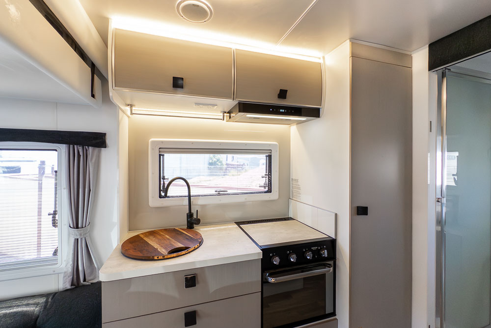The centrally positioned kitchen is designed to make travel cooking simple, offering good bench space, thoughtful storage and all the essentials within easy reach. Whether you’re prepping quick snacks or full meals, it’s a practical zone that doesn’t intrude on the living or ensuite areas.