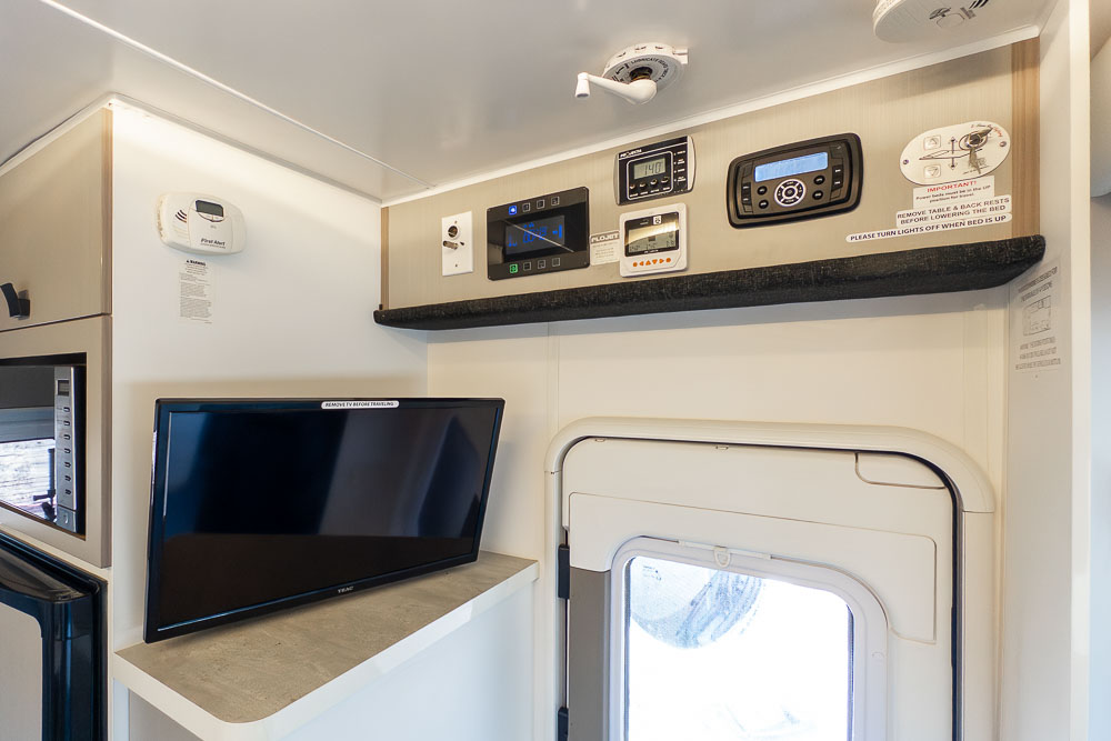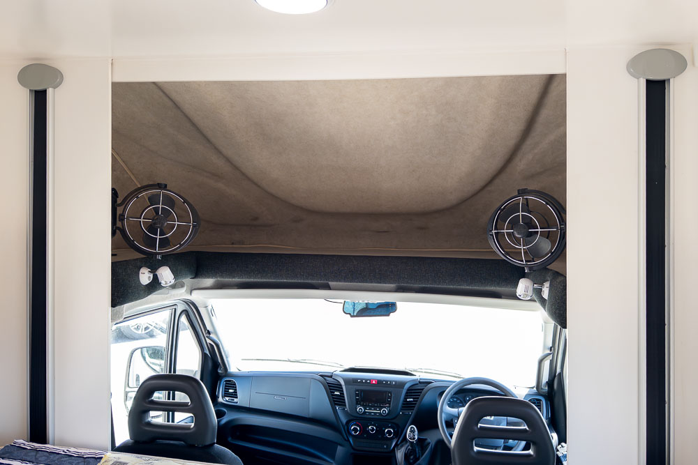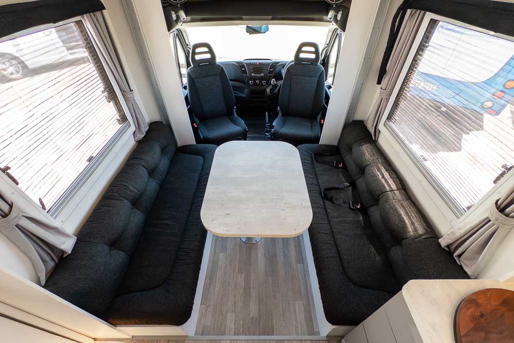 Above, the electric drop-down bed is a signature Pinto feature, providing a comfortable sleeping area without sacrificing precious living space. When you’re ready to start the day, the bed stows neatly overhead, instantly restoring the full lounge.