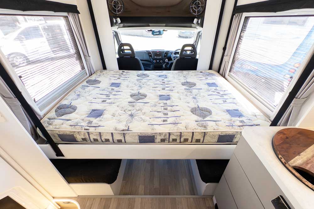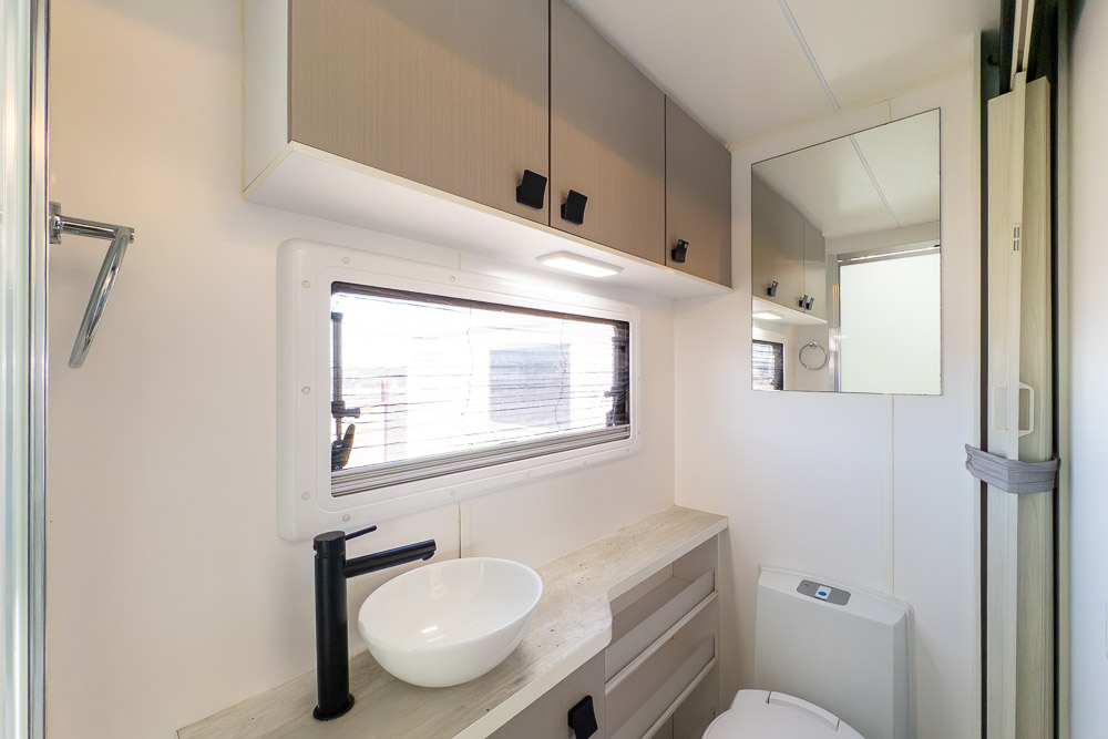 At the rear, the full ensuite spans the width of the motorhome and includes a separate shower, toilet, vanity and excellent storage — a real luxury in a motorhome of this size. It’s a layout that suits travellers seeking comfort and convenience without the bulk of a larger RV.