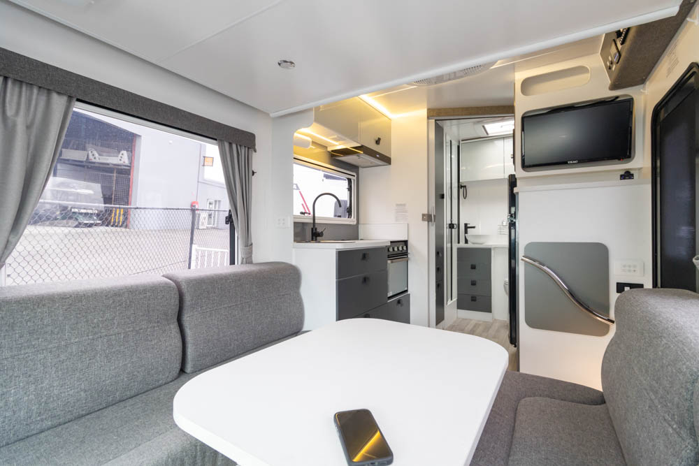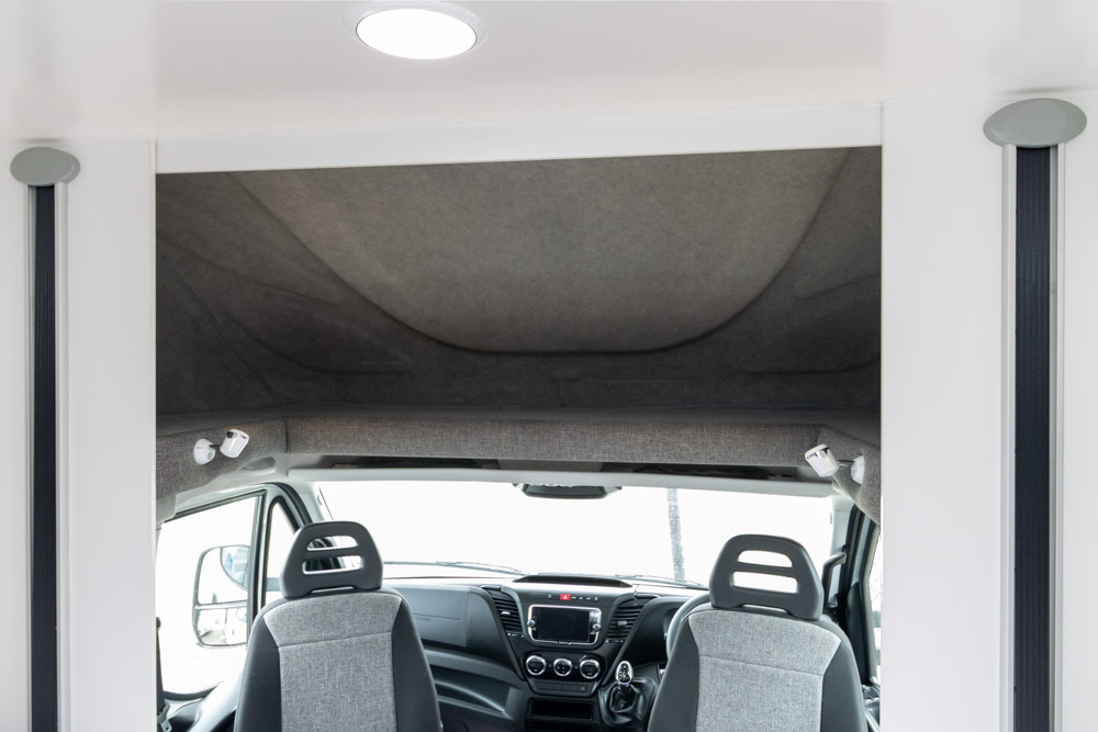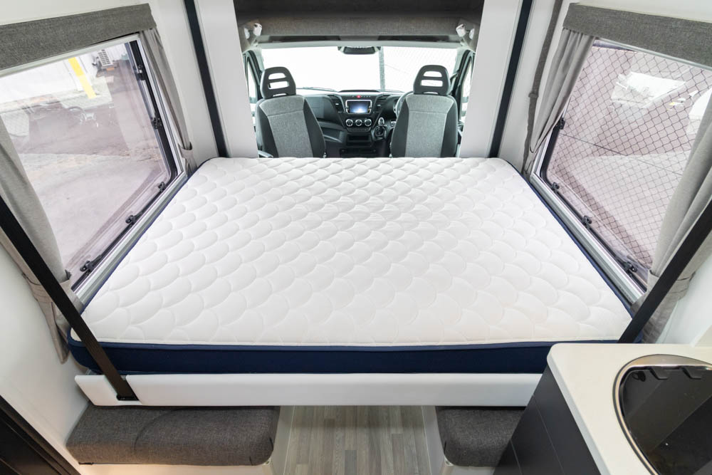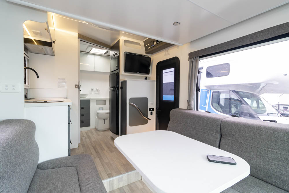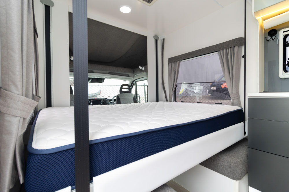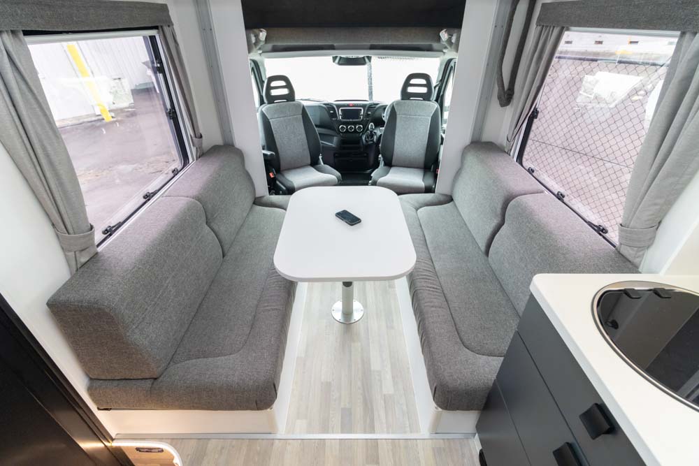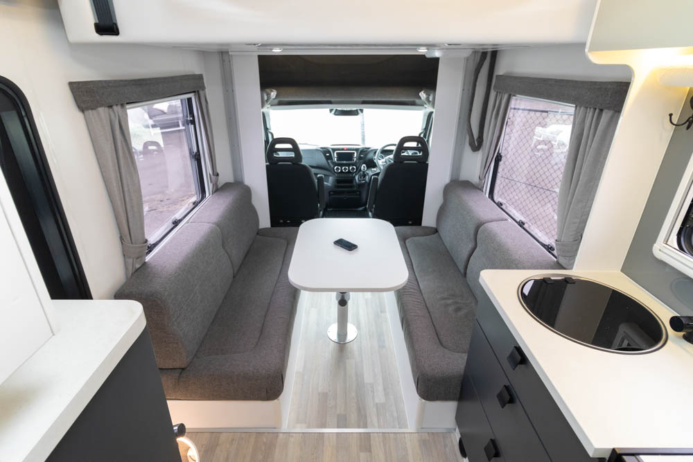 Step inside to a thoughtfully designed interior with face-to-face lounge seating and swivelling cab seats, allowing flexible social spaces. Large windows fill the cabin with light and views, while thick cushions provide comfort after a day on the road. An electric drop-down bed transforms the lounge into a cosy sleeping area in seconds.