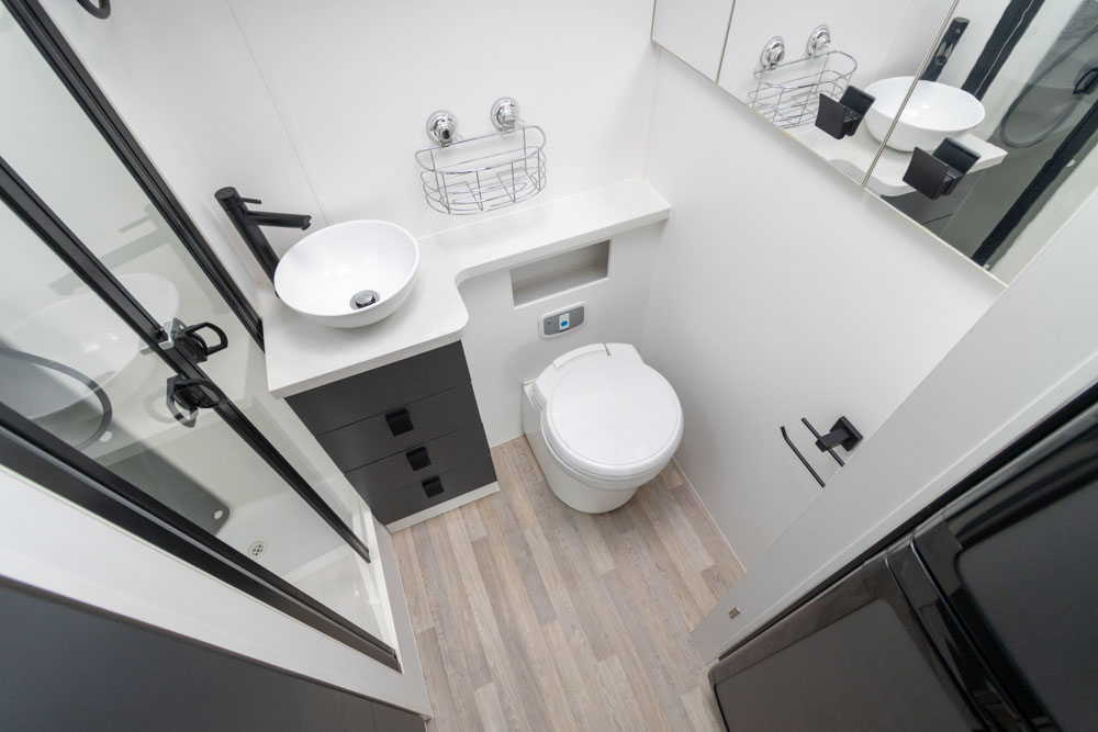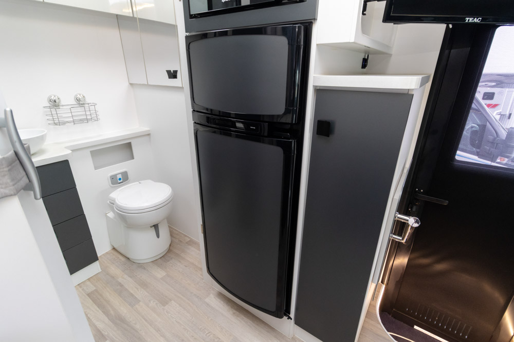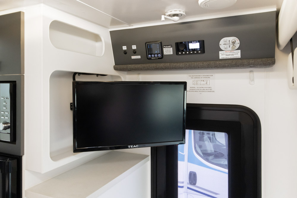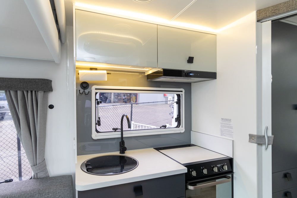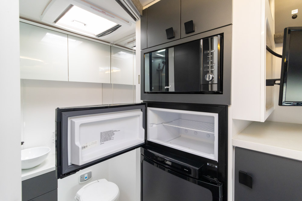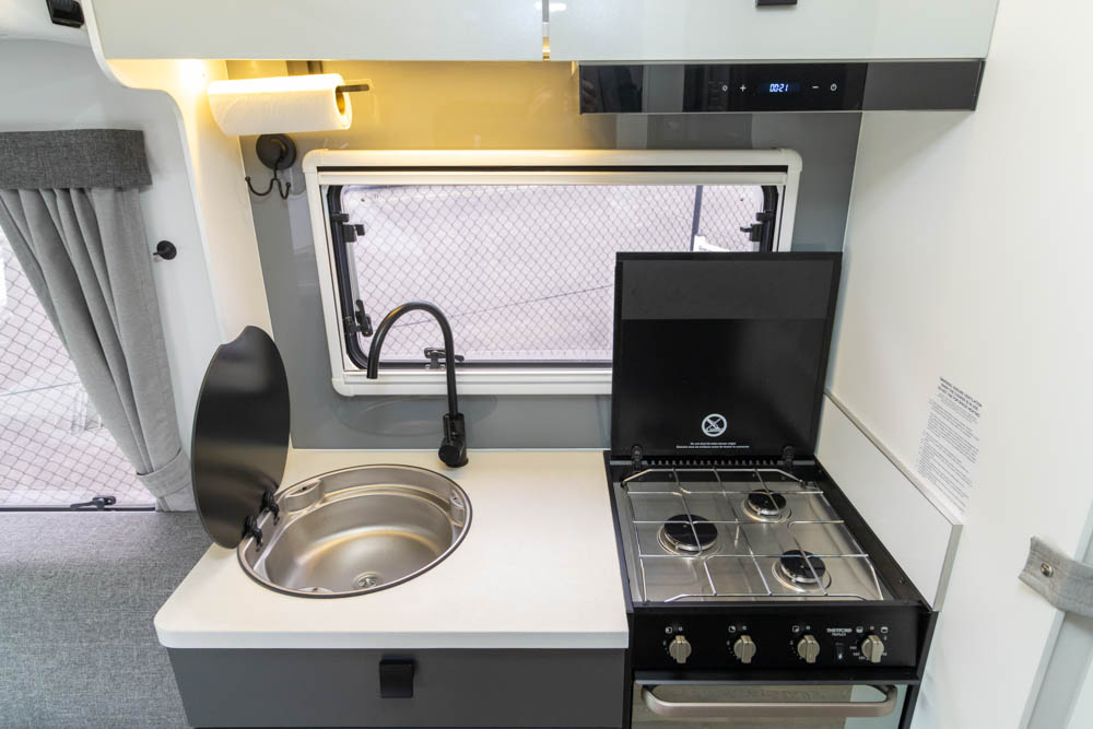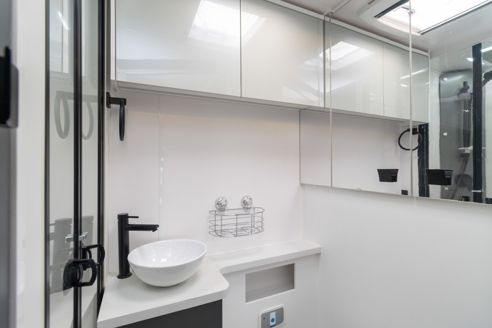 Step inside to a thoughtfully designed interior with face-to-face lounge seating and swivelling cab seats, allowing flexible social spaces. Large windows fill the cabin with light and views, while thick cushions provide comfort after a day on the road. An electric drop-down bed transforms the lounge into a cosy sleeping area in seconds.