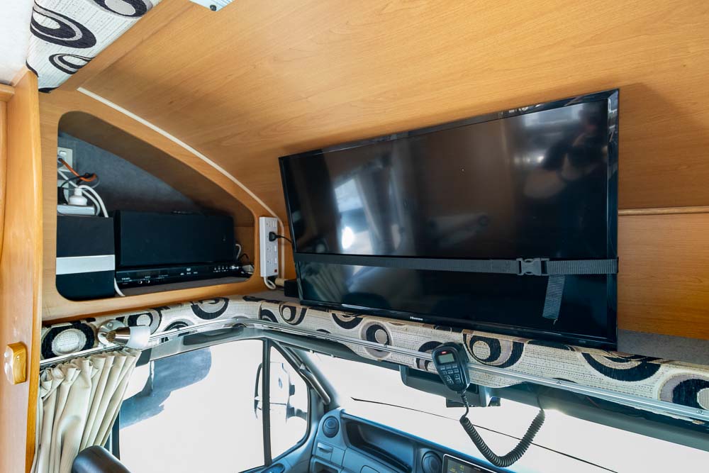 Directly behind the cab, the front living and dining area features twin lounges and a central dinette, creating a welcoming space to relax, dine or plan your next adventure. A TV mounted above the cab ensures entertainment is never far away.
