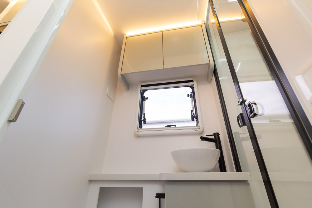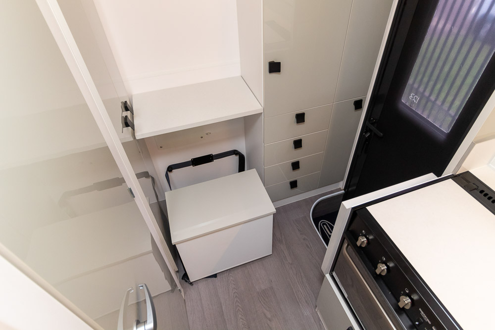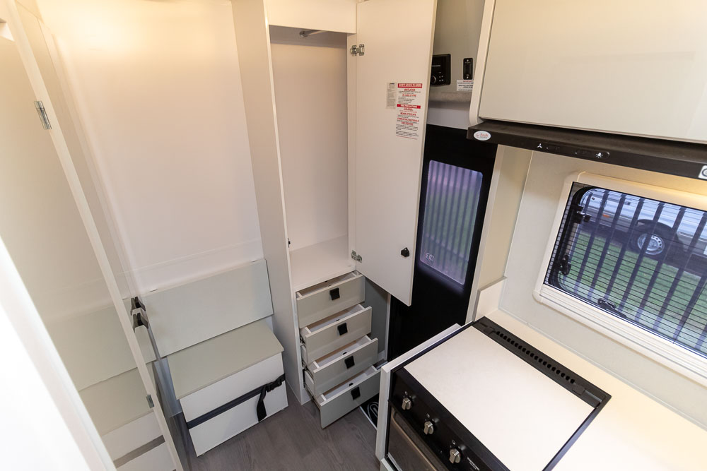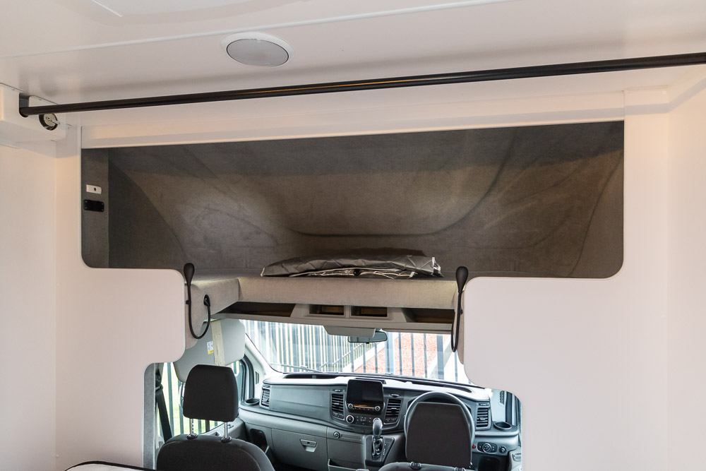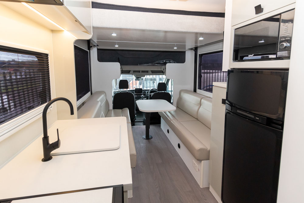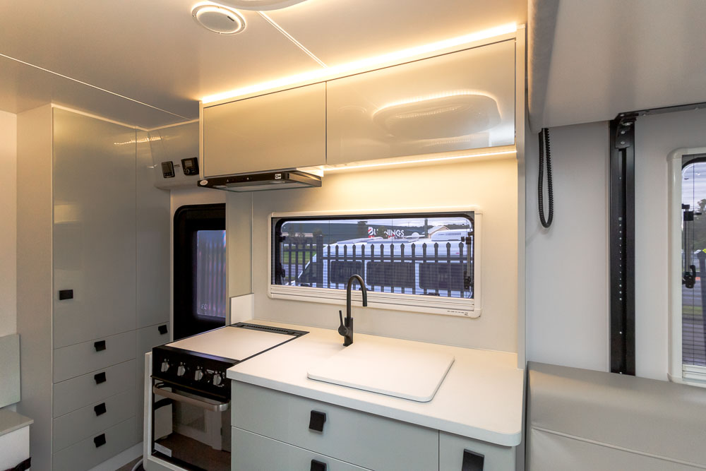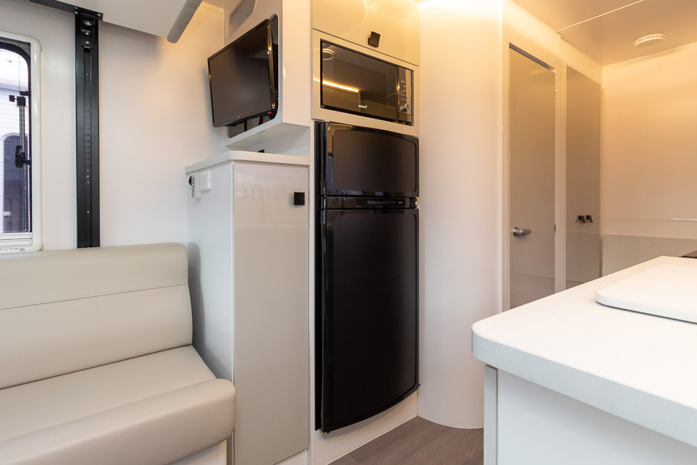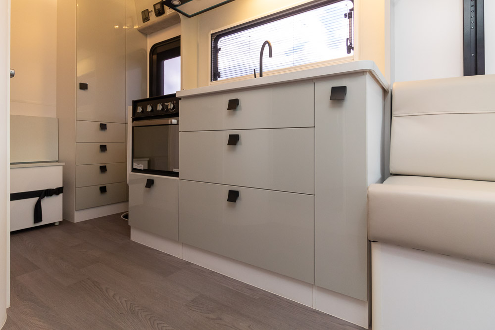Across the rear wall, you’ll find a wardrobe, drawers and additional cupboard storage. A lift-up bench section provides a handy workstation — ideal for a laptop, coffee machine or small office appliances when travelling.