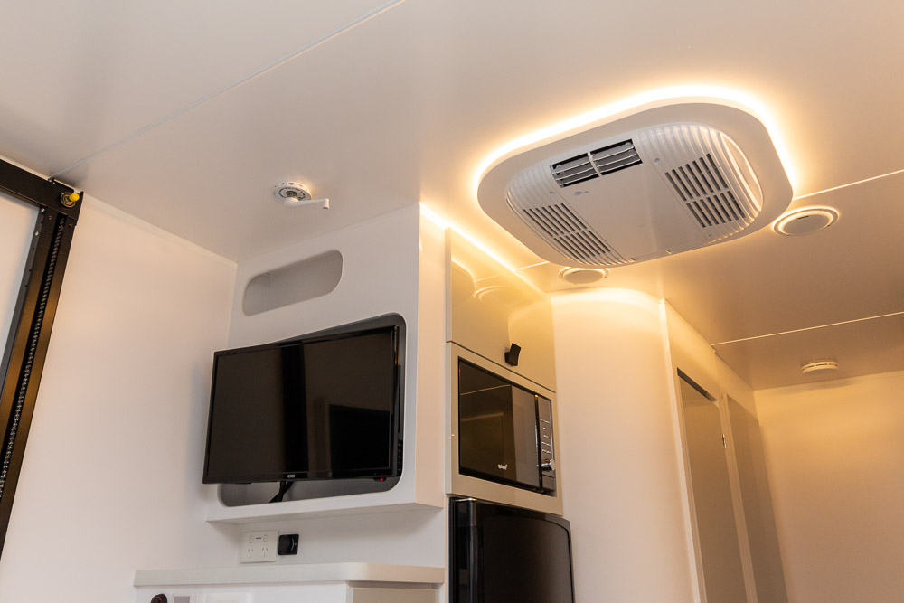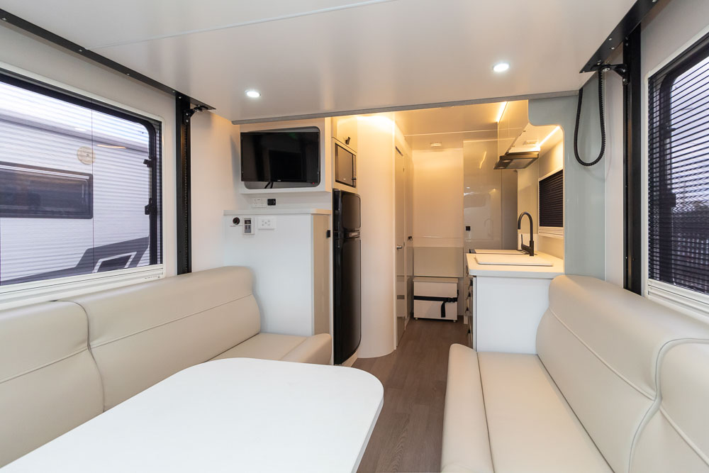 Above this area, the electric drop-down bed lowers effortlessly to create a comfortable sleeping space without compromising daytime living. A wall-mounted TV ensures entertainment is accessible whether the area is set up for dining, relaxing or sleeping.