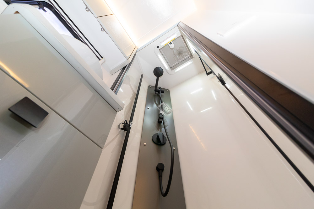 In the rear corner, the dry bathroom design separates the shower and toilet for improved usability. A vanity provides additional storage and convenience, giving you true home-style comfort on the road.
