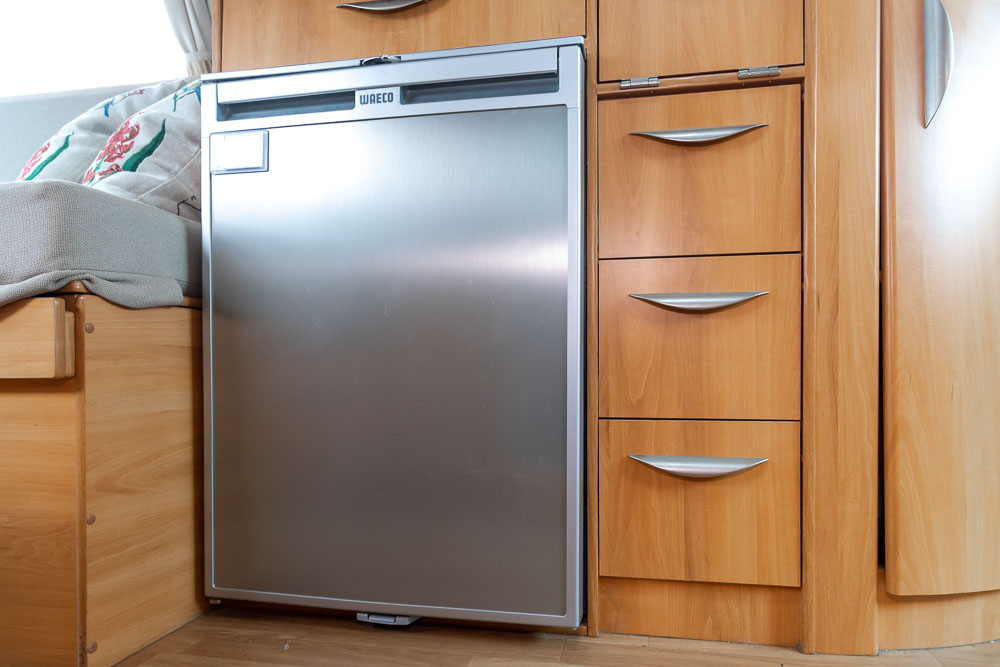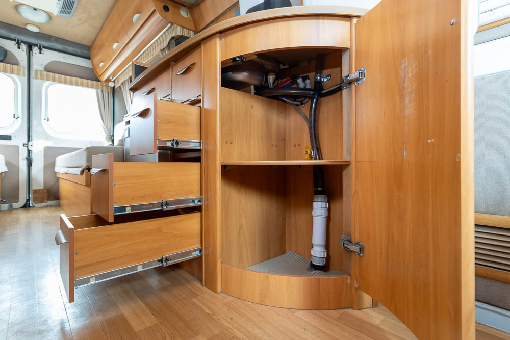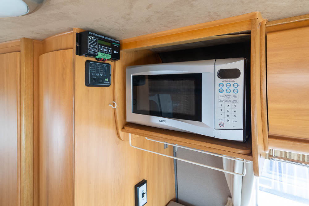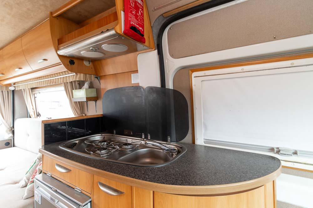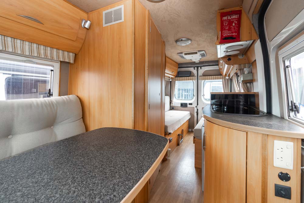 Along the passenger side wall, the mid-mounted kitchen is positioned beside the side entry door, making ventilation and access easy. The benchtop houses a sink and stove with protective lids, while drawers and cupboards provide practical storage for touring essentials. A two-way fridge is neatly fitted under the bench and a microwave is located opposite, keeping the kitchen compact yet fully equipped.