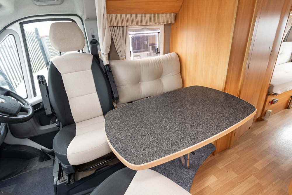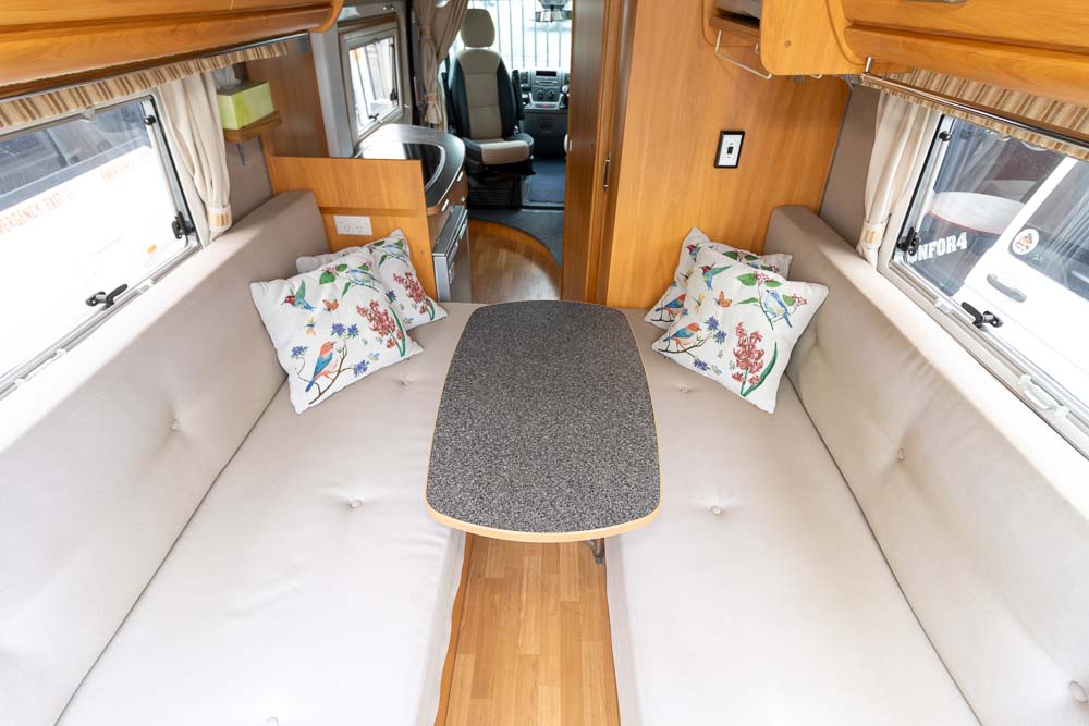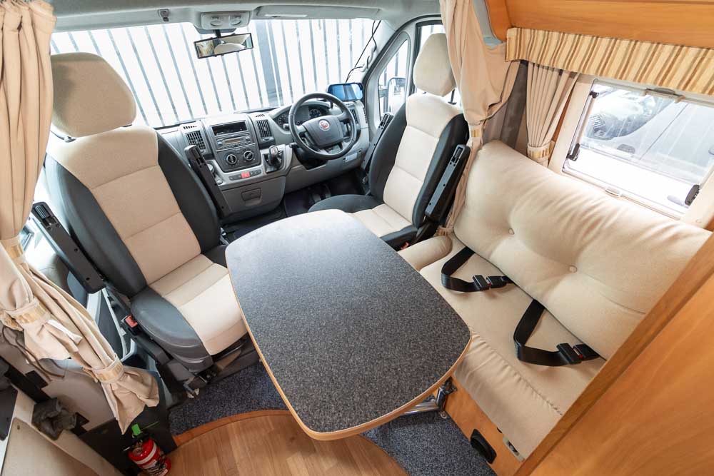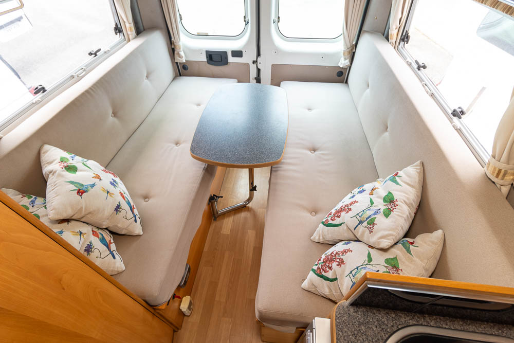 The Sunliner Vista Campervan is thoughtfully designed to maximise space without compromising comfort. At the front, a welcoming dinette lounge seats up to four people, with both driver and passenger cab seats swivelling to integrate seamlessly into the living area. This creates a social and functional space for dining, relaxing or planning the day’s travel.