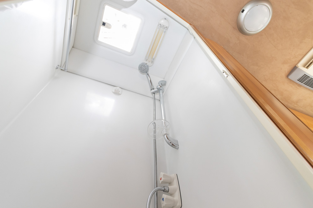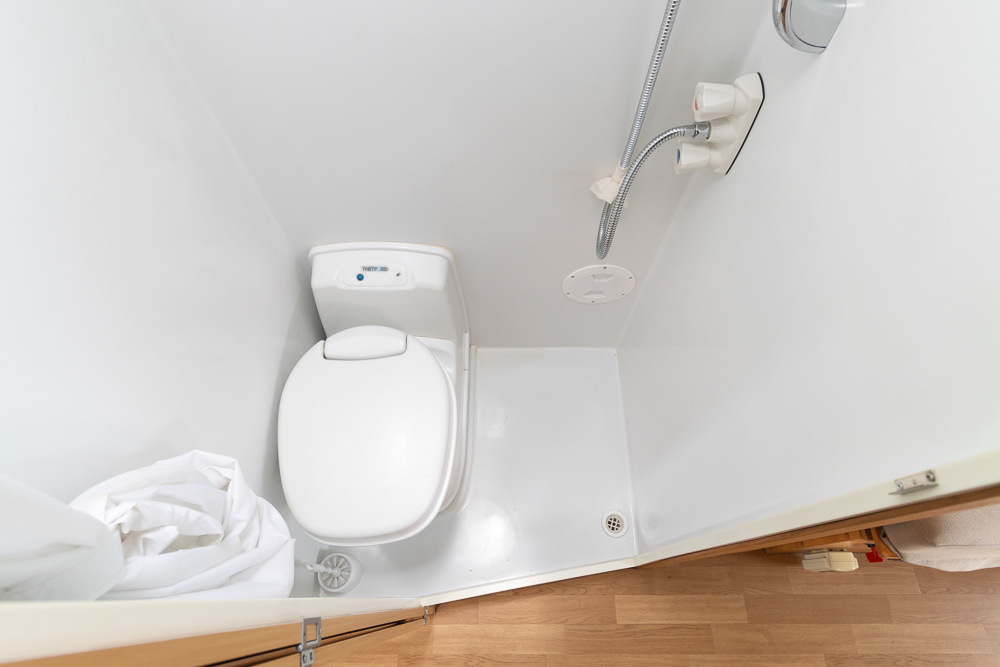 Opposite the kitchen sits the combo bathroom, which is impressively spacious for a campervan of this size. It includes a cassette toilet and shower within a single easy-to-clean wet area, all serviced by a gas hot water system for reliable comfort on the road.