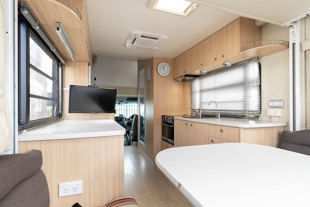 A centrally located kitchen provides the essentials for preparing meals on the road and offers an impressive amount of preparation space and storage for a motorhome of its length. The adjoining bathroom includes a shower and toilet for self-contained touring convenience. This practical arrangement allows travellers to enjoy the freedom of exploring Australia while maintaining everyday comforts.